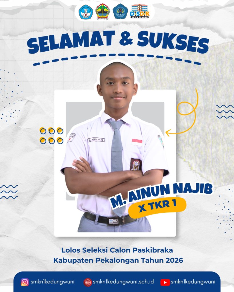 Kabupaten Pekalongan, 18 April 2026 — Kabar membanggakan datang dari SMKN 1 Kedungwuni. Salah satu siswa terbaiknya, M. Ainun Najib dari kelas X TKR 1, berhasil lolos seleksi Pasukan Pengibar Bendera Pusaka (Paskibraka) tingkat Kabupaten Pekalongan tahun ini.